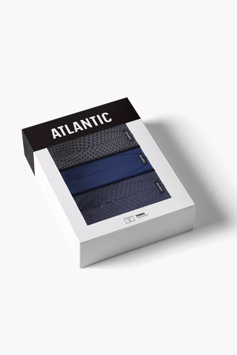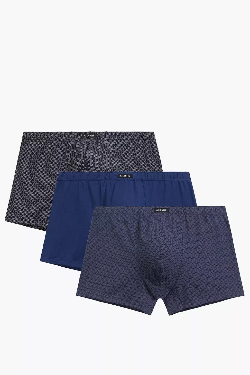 Bokserki męskie obcisłe Atlantic model 3MH-232. Pakowane po trzy sztuki w kolorach: granatowy, ciemny niebieski, denim.