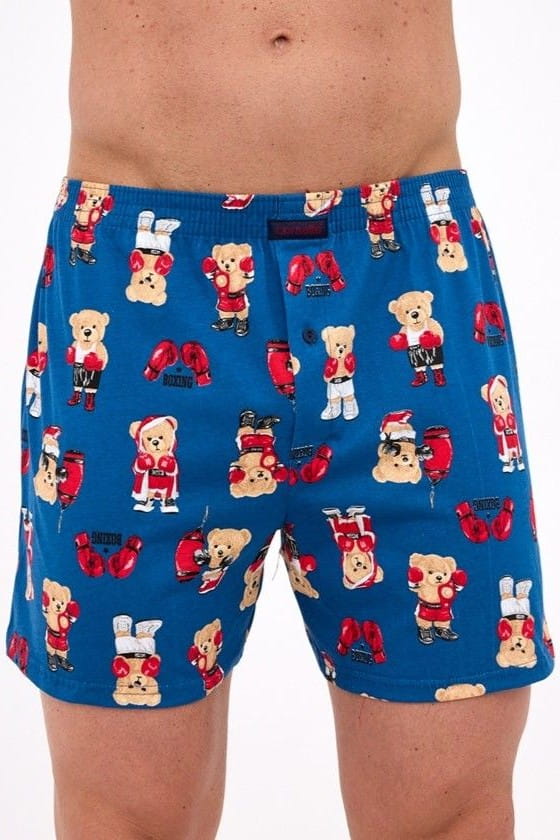 Niebieski luźne bokserki. Wzór: misie bokserzy.