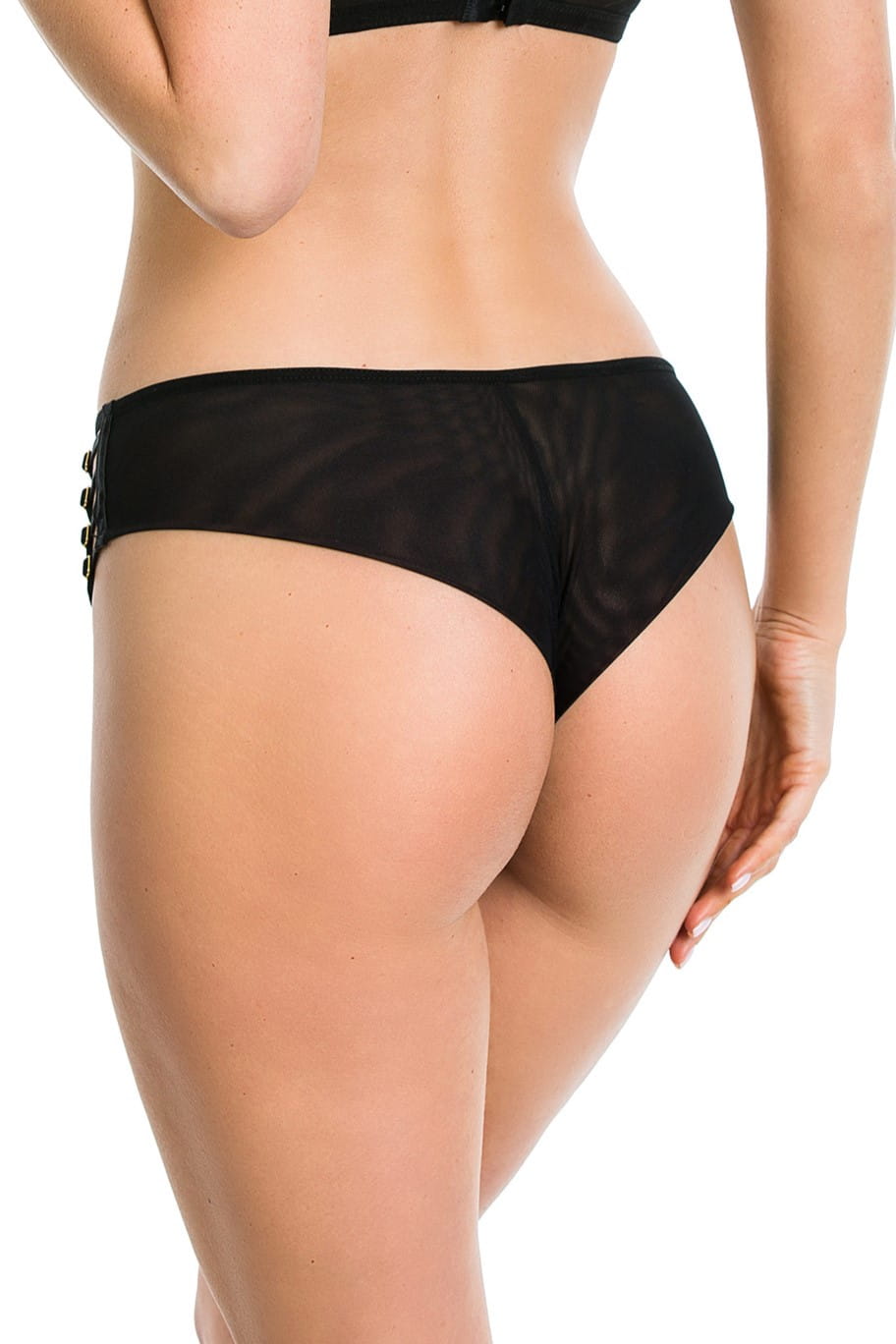 Brazyliany damskie Mediolano Delice 19091 o tiulowym przodzie zdobionym koronką, przód i tył wykonane z siateczki. Na biodrach figi zdobione są regulowanymi paskami z klamerkami.