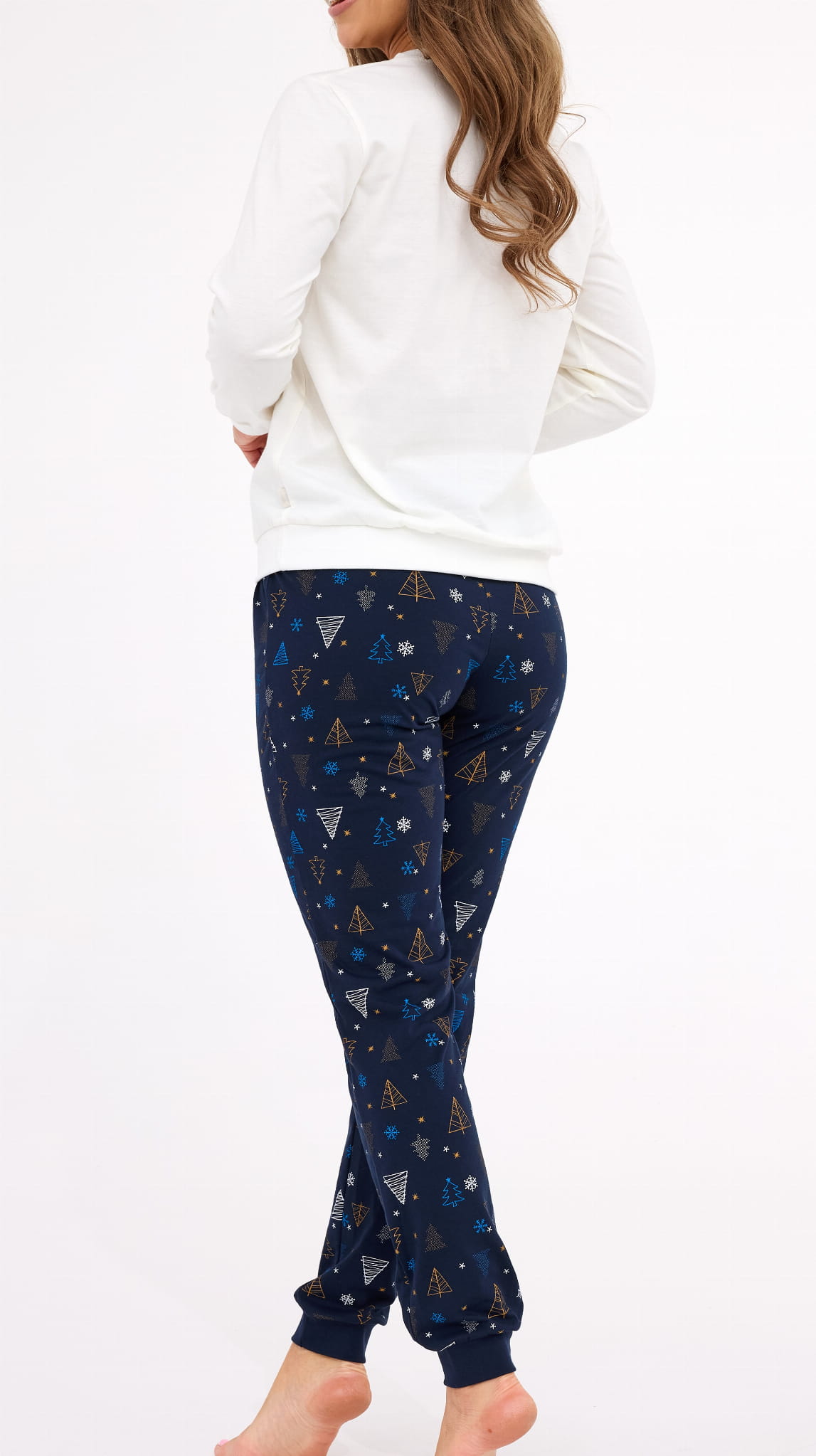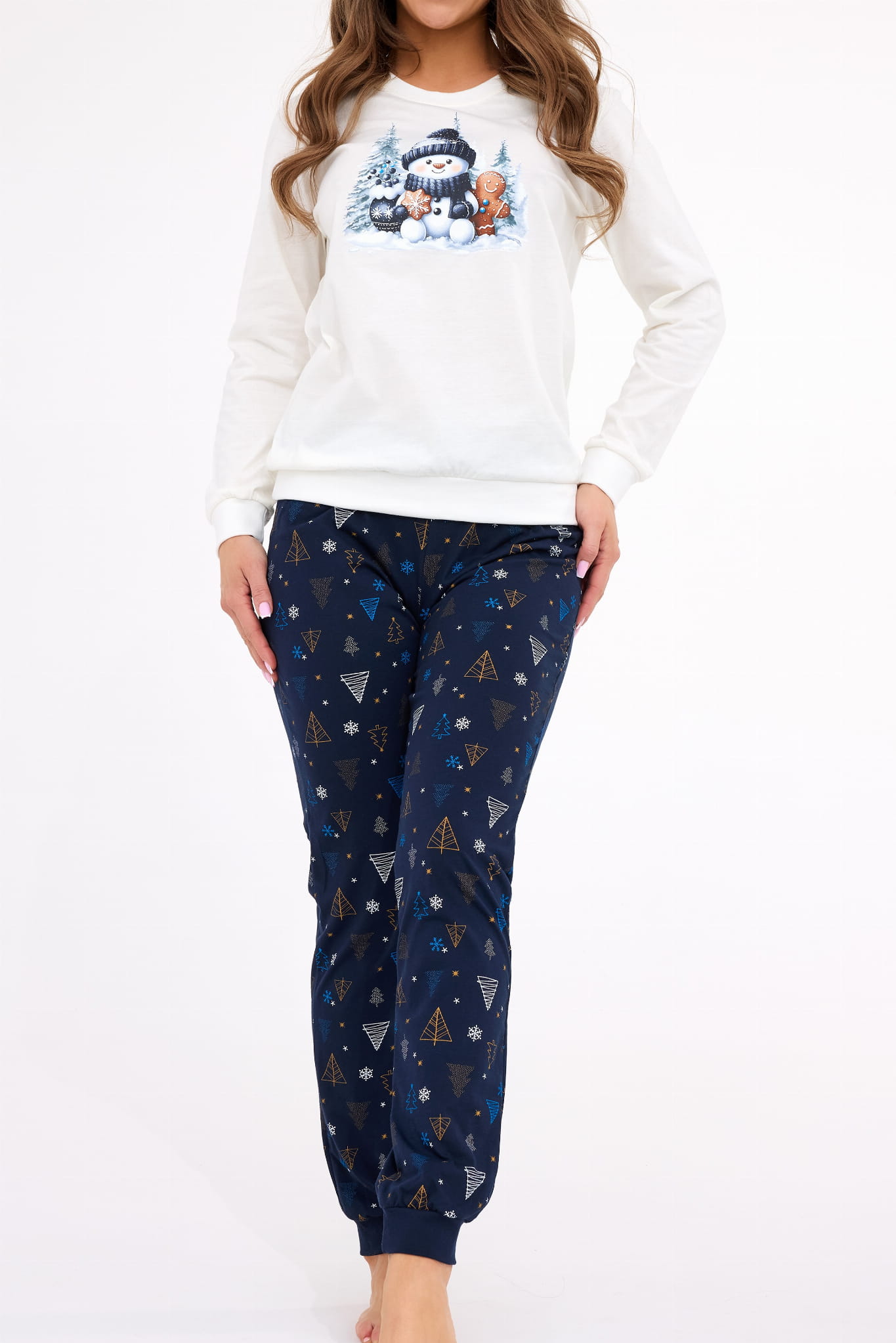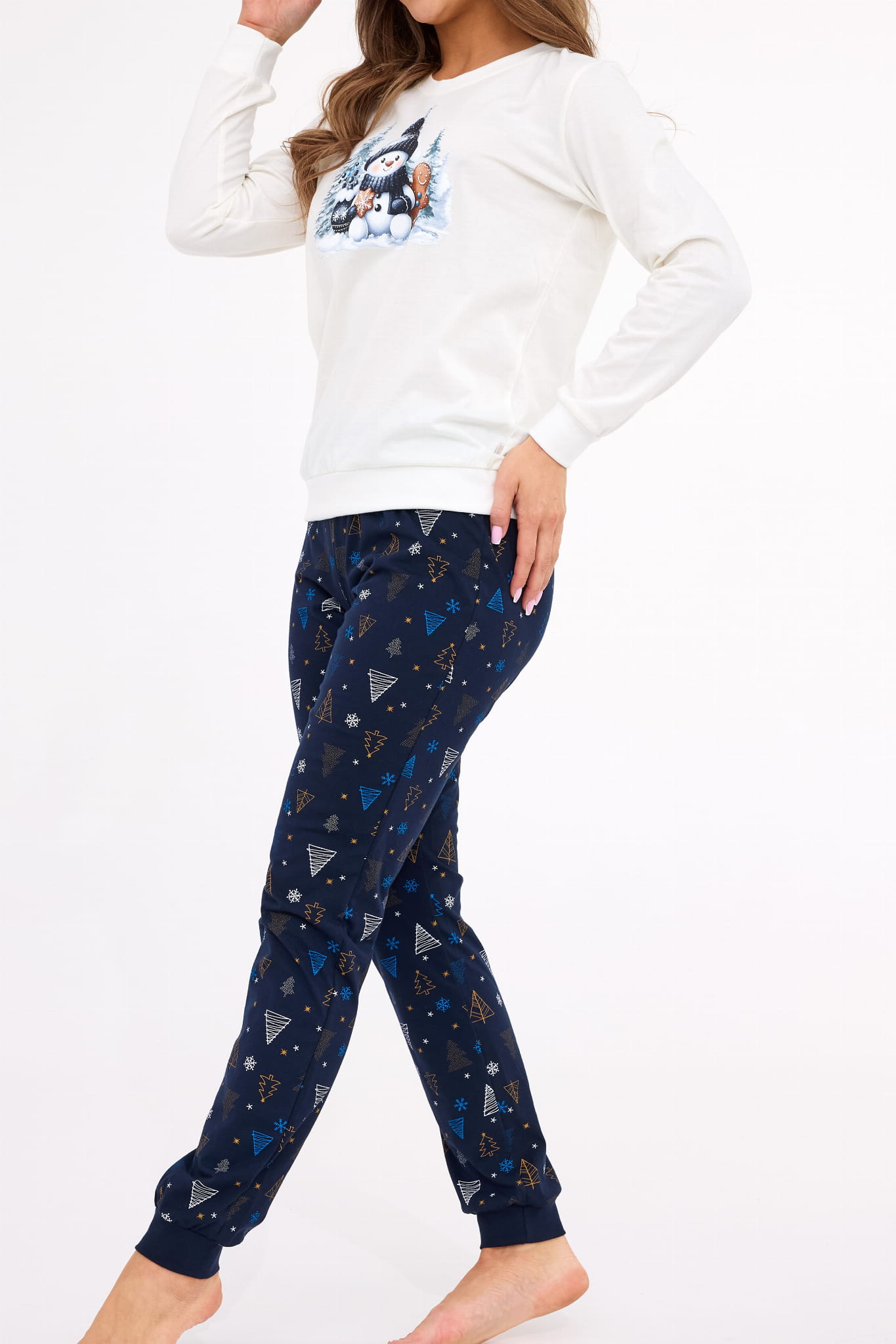 Bawełniana piżama damska z długim rękawem i długimi spodniami Cornette 721/427 "Snowy day" biała bluzka, granatowe spodnie