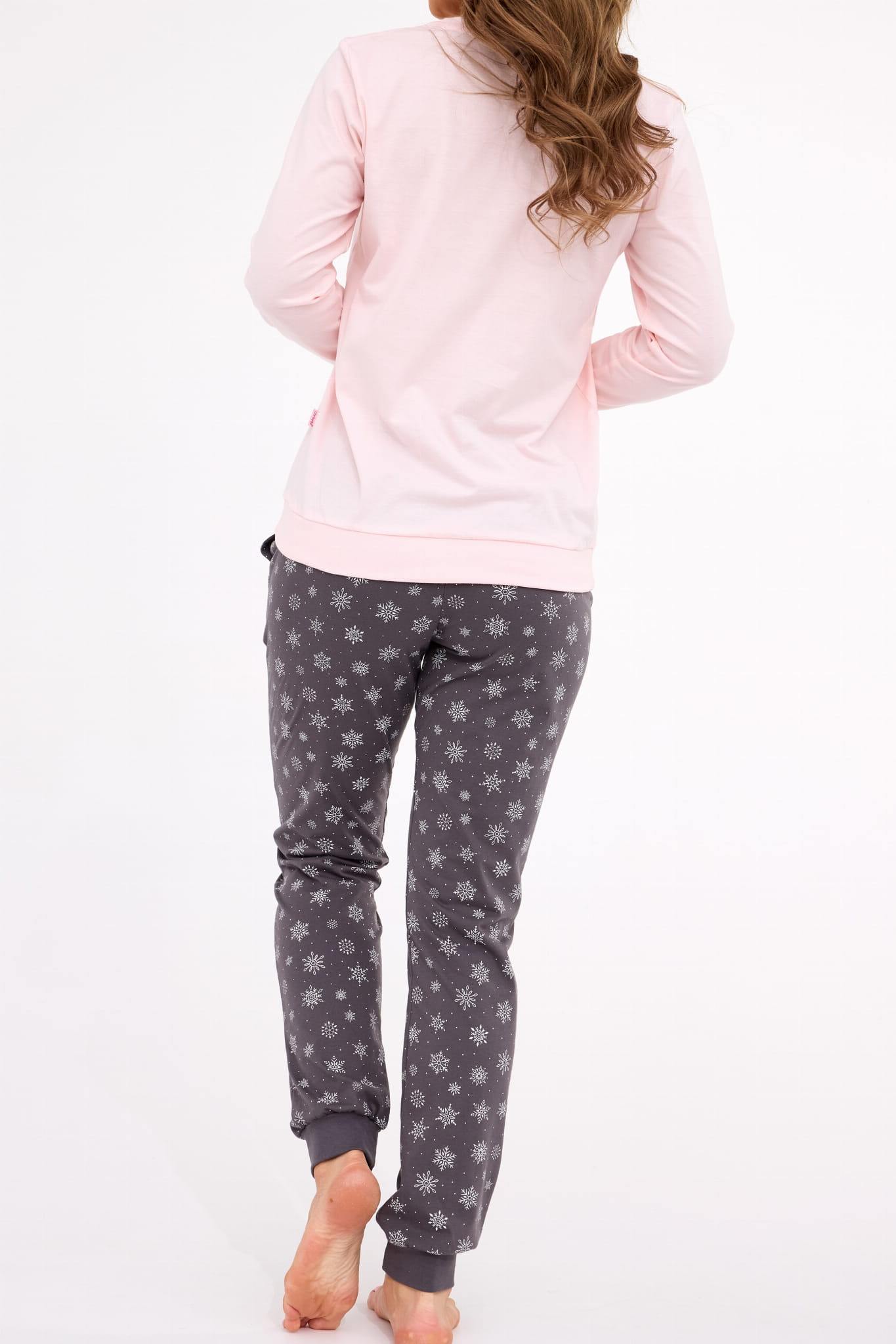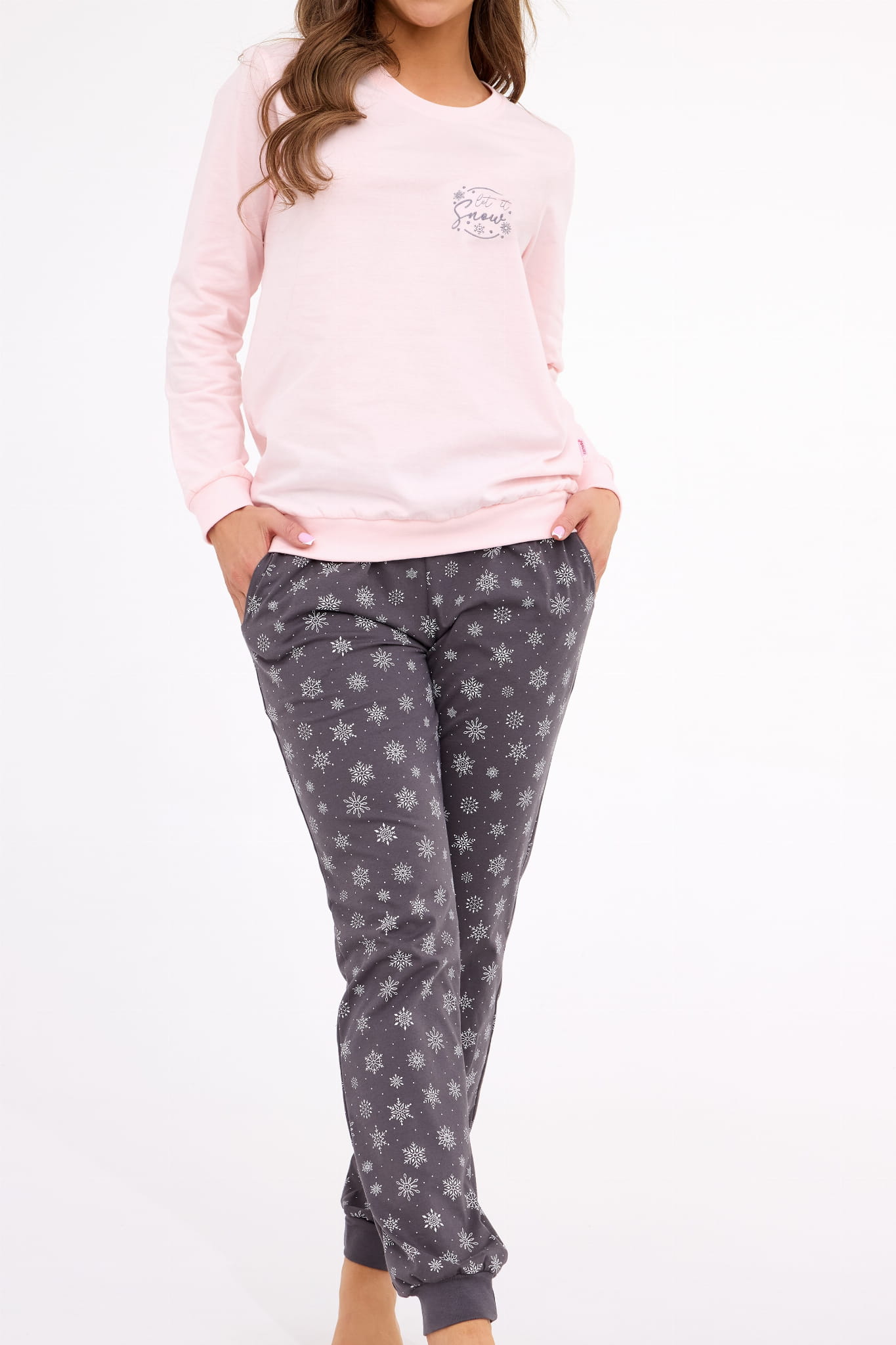 Świąteczna piżama damska wykonana z wysokiej jakości bawełny. Dół bluzki, rękawy i spodnie zostały zakończone ściągaczami. Na spodniach widnieją nadrukowane płatki śniegu, natomiast na bluzce znajduje jeden, mniejszy nadruk "Let it snow" otoczony śnieżynkami. Piżama ta jest idealnym pomysłem na prezent.