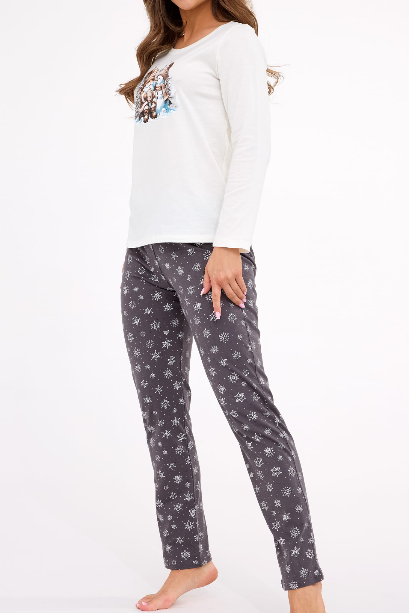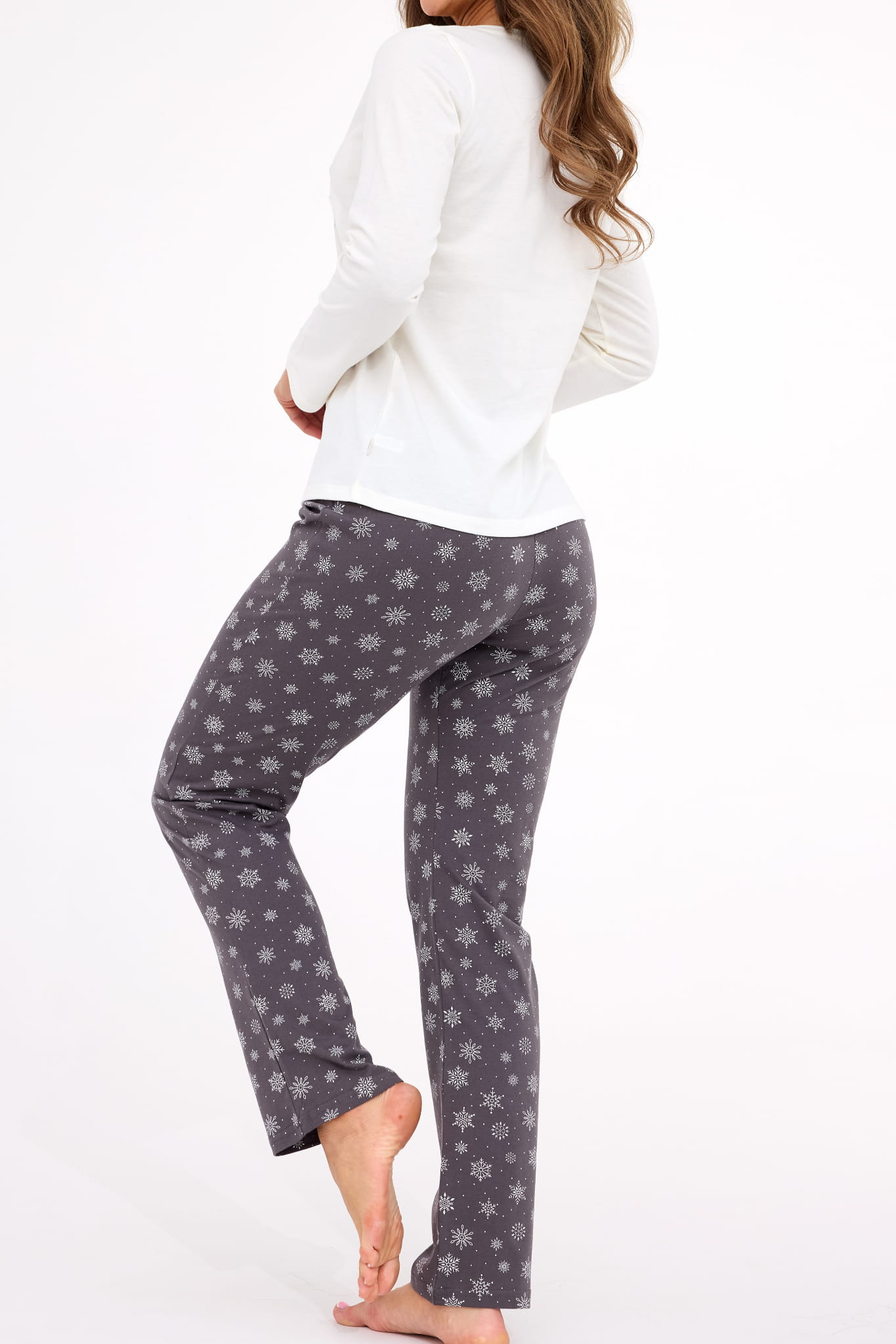 Świąteczna piżama damska o luźnym kroju wykonana z wysokiej jakości bawełny. Na szarych spodniach widnieją nadrukowane płatki śniegu, natomiast na śmietankowej bluzce znajduje jeden, większy nadruk świątecznej scenerii. Piżama ta jest idealnym pomysłem na prezent.