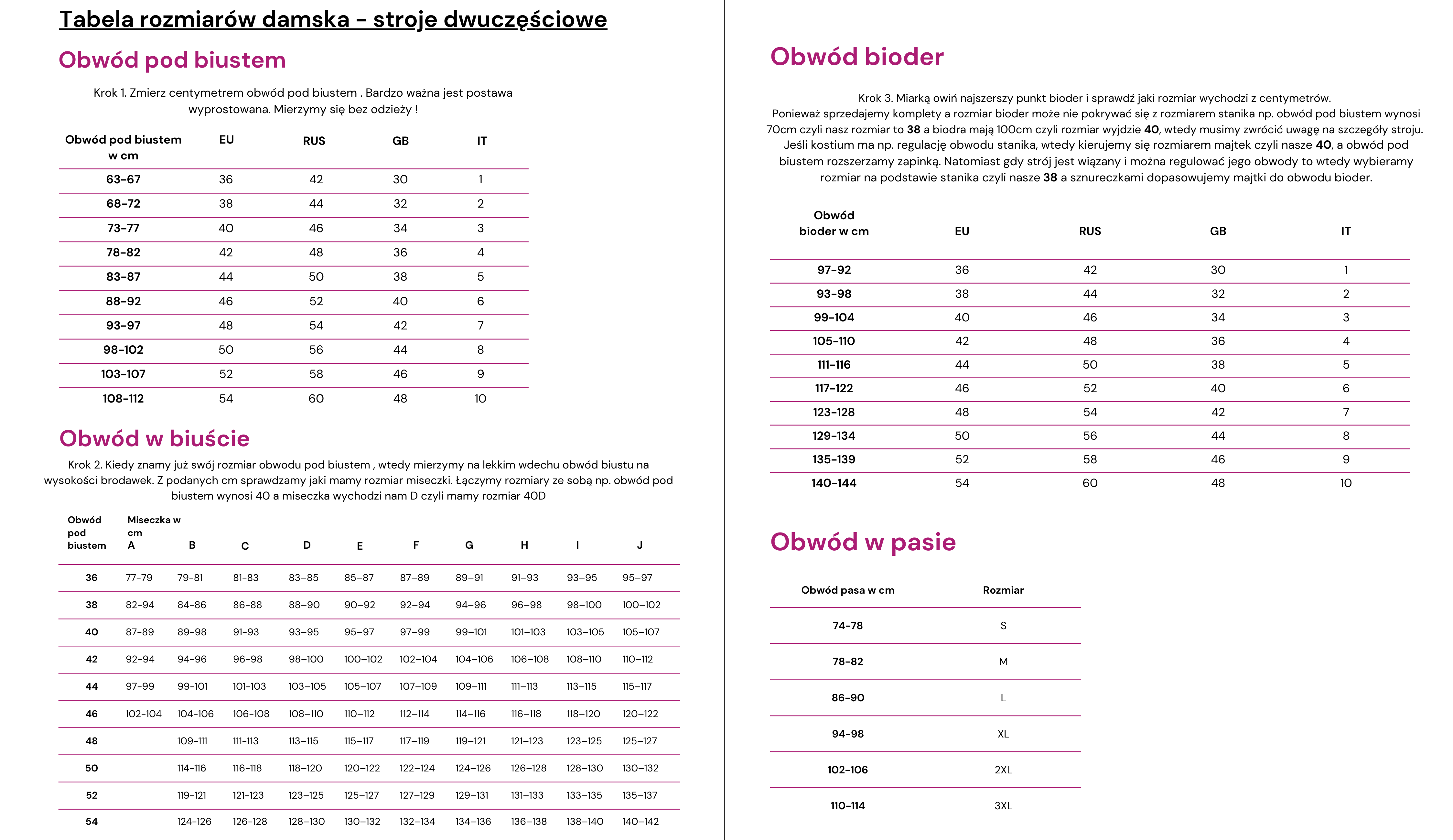 - Rozwiązania: Odpinane ramiączka, brak wkładek w dużych miseczkach (D+), regulowane boki majtek.